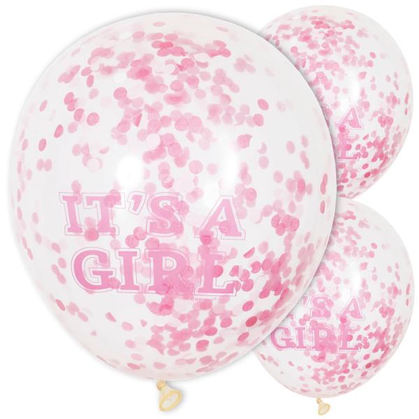 Konfetti Ballonger It's a Girl innefattar ett paket med flera ballonger som går att fylla med rosa konfetti (som medkommer), de går även att fyllas med helium. Texten på är i rosa och det står "It's a girl". Det medföljer en tratt för att fylla ballongerna med konfetti.
