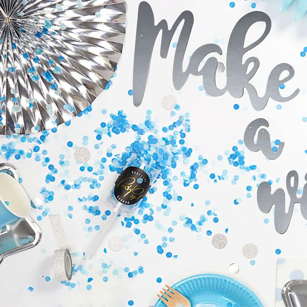 Härlig push pop confetti full av papper konfetti i snygg blå och mintfärg, en skojig konfetti-kanon som passar utmärkt för olika festligheter, perfekt för alla papperskonfetti fans. En konfetti-bomb är ett säkert kort för ett extra festligt firande med härligt konfetti-regn.