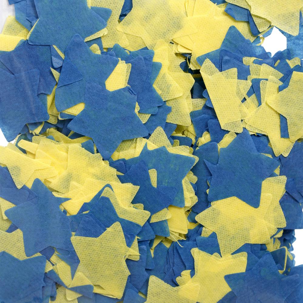 Konfetti Stjärnor Blå/Gul 15 g består av konfetti i blått och gult, format som stjärnor och tillverkat av tunt silkespapper.