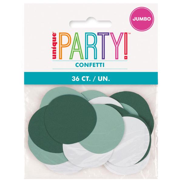 Konfetti Stora Prickar Grön/Vit består av grön & vit papperskonfetti i form av runda prickar. Varje prick mäter ca 3.5 cm i diameter.