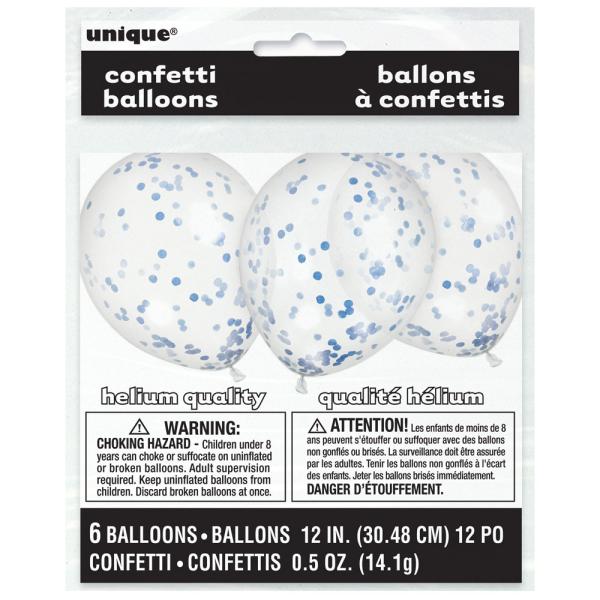 Konfettiballonger Royal Blue består av ett 6-pack genomskinliga ballonger, 14 gram mörkblå konfetti, samt en papp-trapp. Häll ner konfettin i ballongerna med hjälp av tratten innan uppblåsning. Blås upp ballongerna med luft eller helium. Ballongerna är tillverkade i latex.