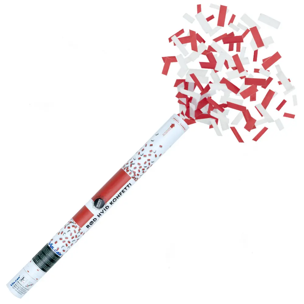 Konfettikanon Röd & Vit 60 cm omfattar en lång konfettikanon som skjuter ut vita och röda papperskonfetti när kanonens nedre del vrids på.