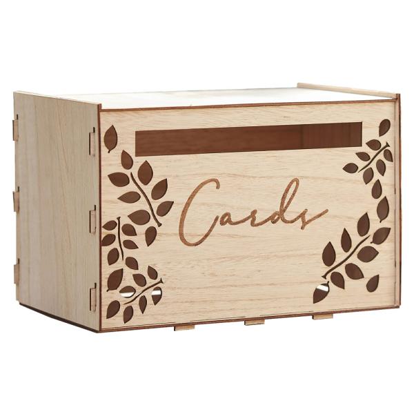 Kortlåda A Touch of Pampas omfattar en fin kortlåda av trä med dekorativ "Cards" text och utskurna blommotiv. Lådan är ca 20 cm hög och 30 cm bred. Den levereras i fyra delar som enkelt monteras ihop likt ett pussel.