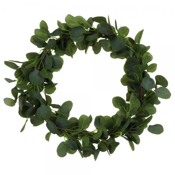 Krans Eukalyptus omfattar en ca 40 cm stor krans av konstgjord eukalyptus. Tillverkad av polyester.