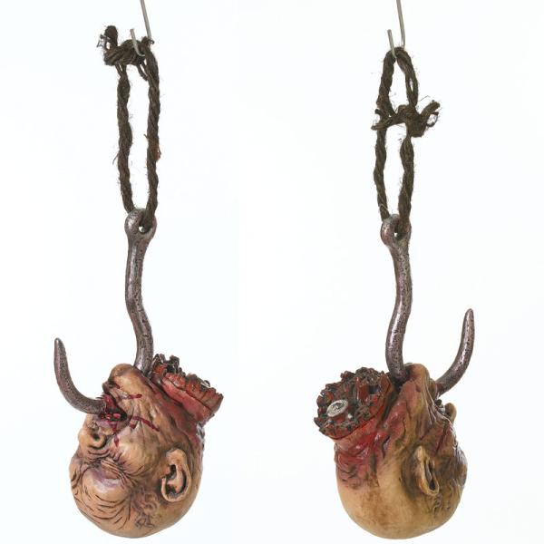 Häng upp denna hängande Halloween dekoration föreställande ett avhugget huvud hängandes på en krok för en riktigt läbbig Halloweenfest!