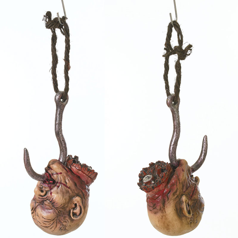 Huvudet är tillverkat i latex och har en krok som går in under haka och ut genom munnen med medföljande hänganordning.