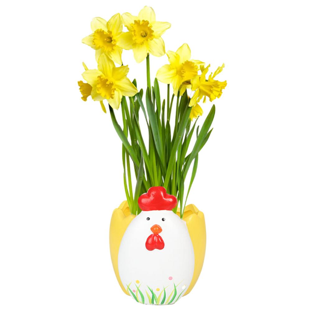 Den här påskkrukan i form av ett ägg med en söt vit kyckling passar perfekt som en blomkruka till påsk. En rolig och färgglad kruka med påskmotiv som lyfter både växter och påskstämningen.