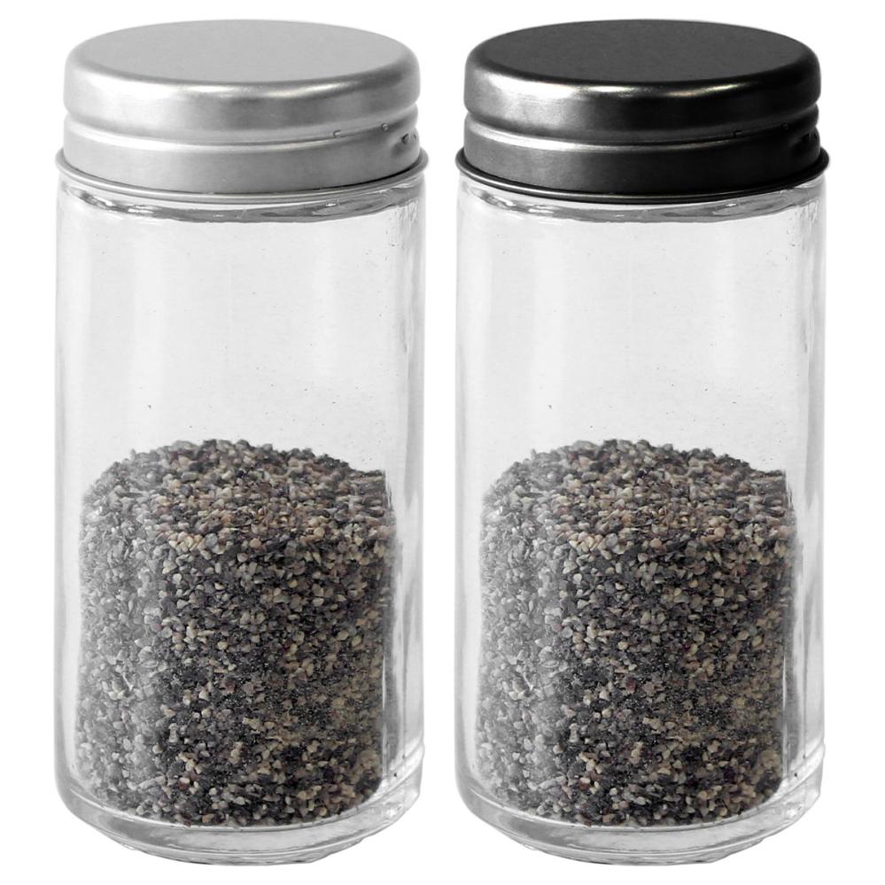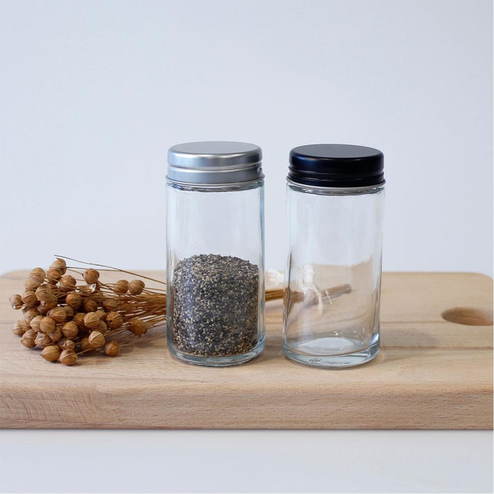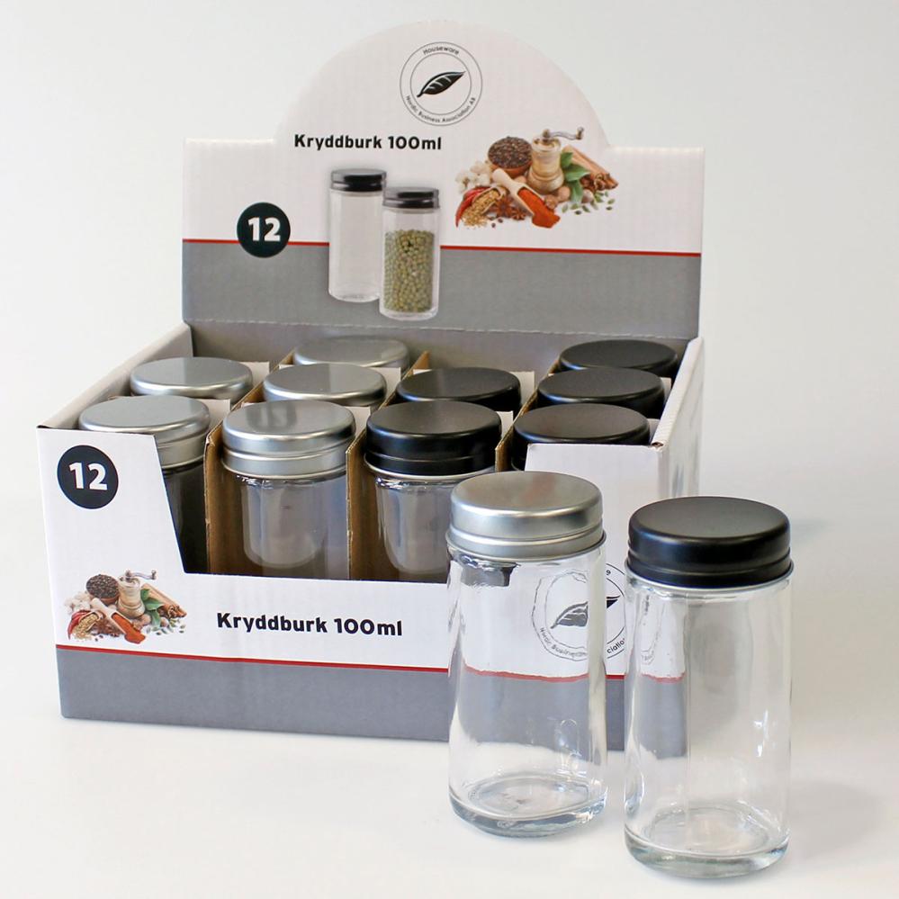 Kryddburk med Lock 4,4 x 9,5 cm omfattar en liten kryddburk i glas med ett skruvbart lock i metall. Locket finns i två olika färger: svart och silver.