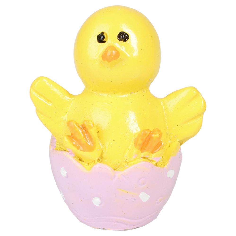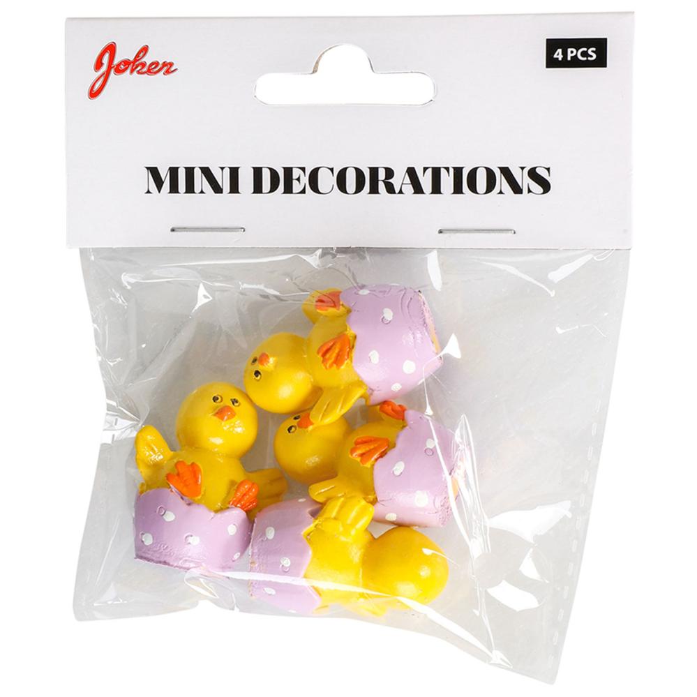 Kyckling i Äggskalshalva 3x4 cm 4-pack innehåller små dekorationer i form av gula kycklingar i lila äggskalshalvor med vita prickar.