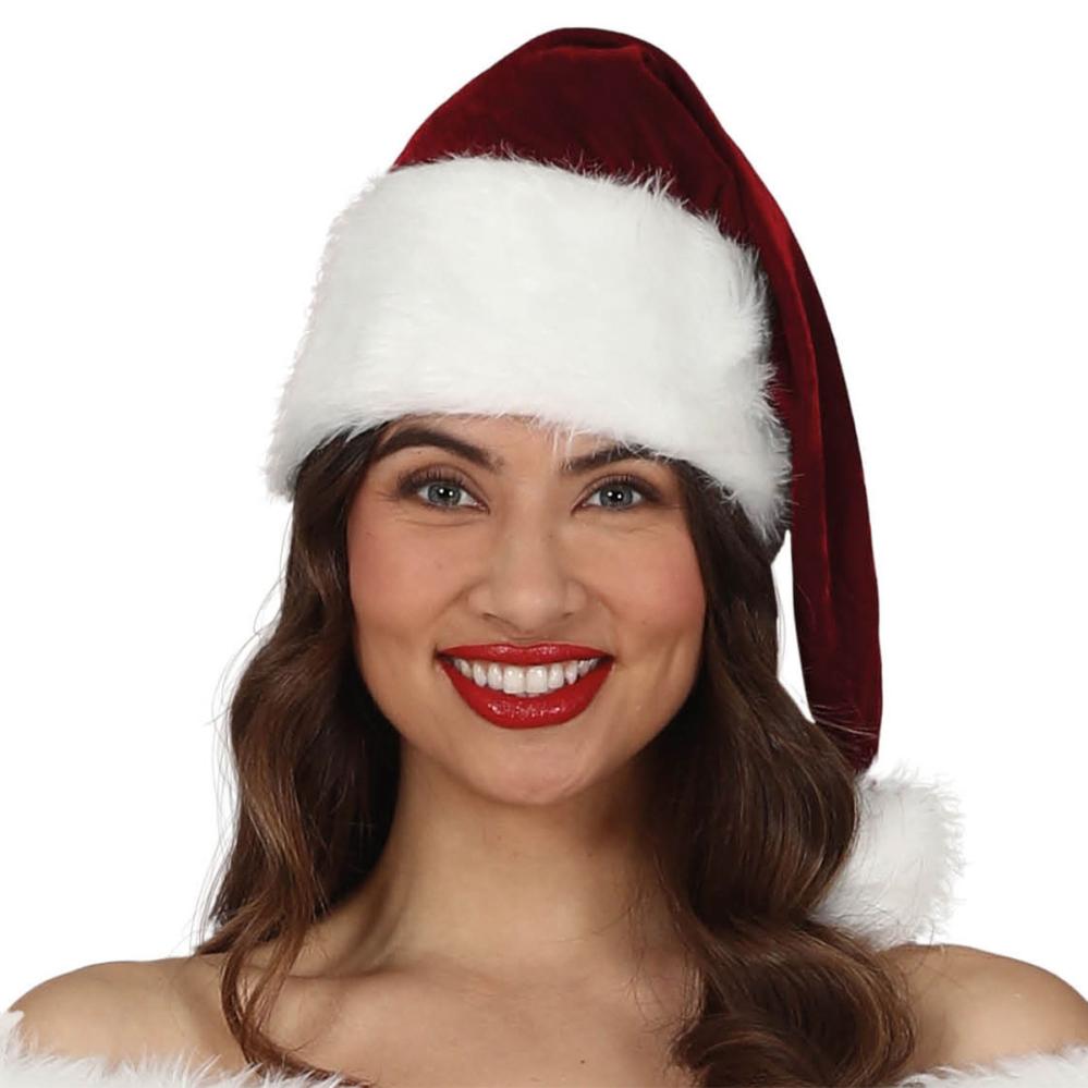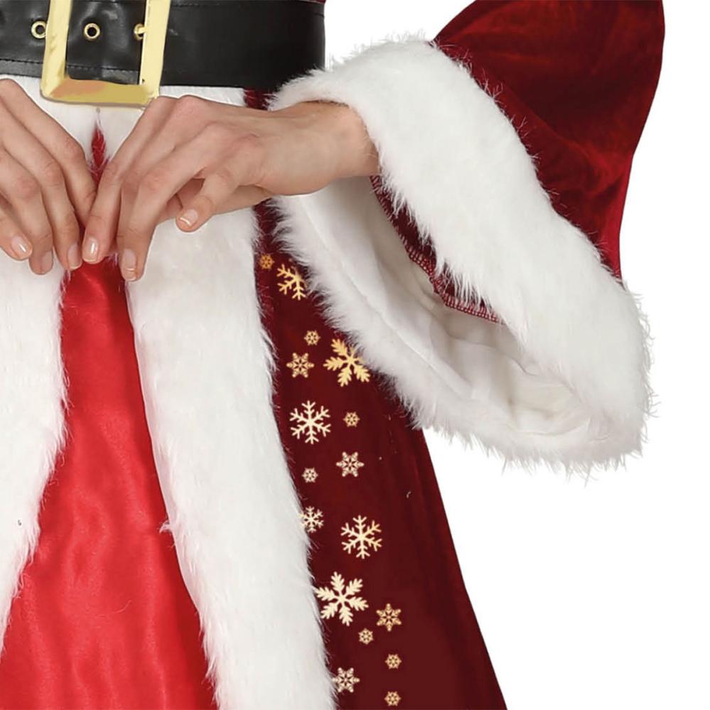 Lång Julklänning med Tillbehör omfattar en juldräkt med en tomteluva, ett svart midjebälte med guldspänne och en lång röd julklänning med vit fuskpälskant och guldfärgade snöflingor på sidorna.