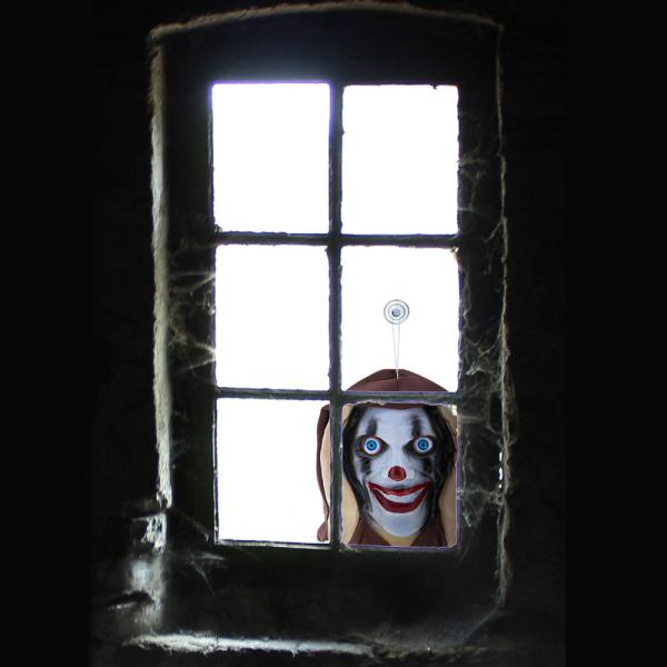 Skräm vettet ur alla på din fest med denna otäcka halloweendekoration! Den här läskiga clownen fäster du enkelt mot fönstret så att det ser ut som att han kikar in. Sätt upp den i fönstret inför din halloweenfest och se hur alla dina gäster hoppar till av rädsla när de får syn på de läskigt skimrande ögonen. En riktigt obehaglig fönsterdekoration som helt klart kommer att göra din halloween en hel del mycket läskigare!