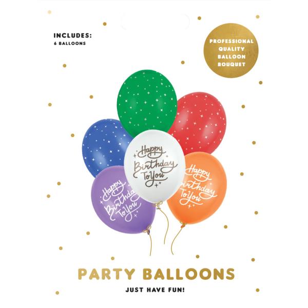 Latexballonger Happy Birthday To You Mix omfattar ett 6-pack med födelsedagsballonger i olika färger. Ballongerna finns i blått, rött och grönt med motiv av små vita stjärnor samt i orange, lila och vitt med "Happy birthday to you" text i vitt och guld. Ballongerna rymmer ca 15 liter styck och blir ca 30 cm stora. Ballongerna är tillverkade i latex och fylls med luft eller helium.
