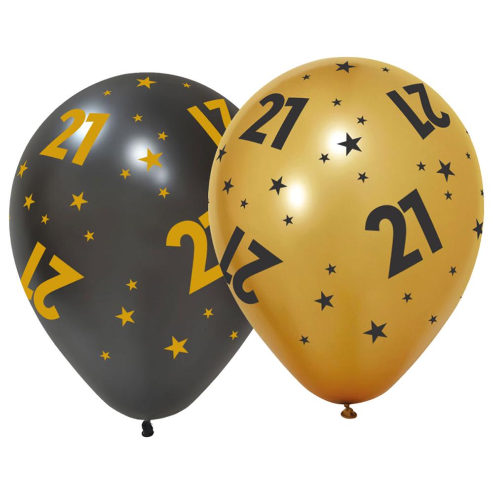 Latexballonger med Stjärnor & Siffran 21 6-pack innehåller sex latexballonger varav tre har stjärnor och siffran "21" i svart på guldfärgad bakgrund och de andra tre har samma motiv i omvända färger.