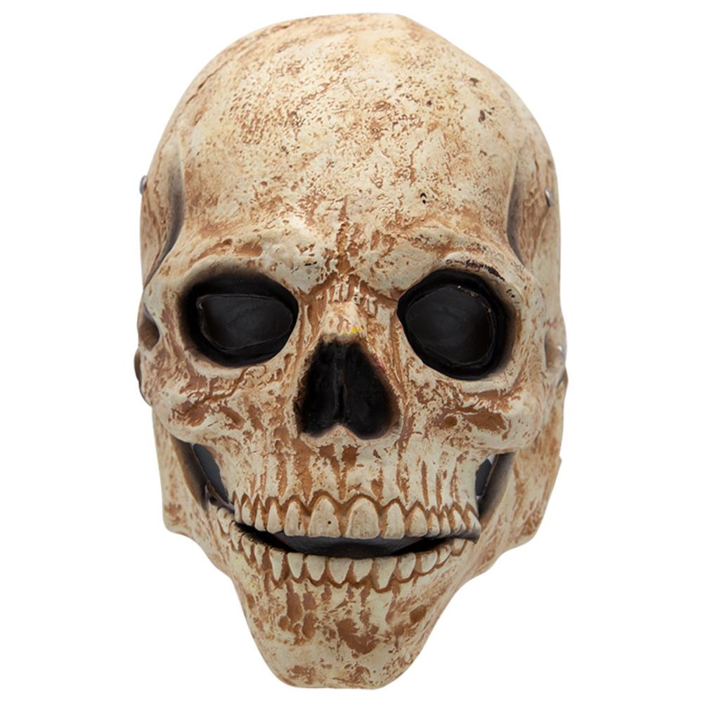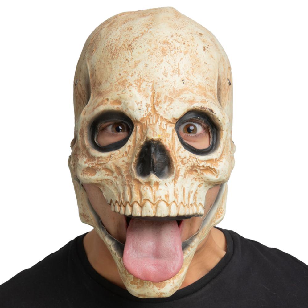 Latexmask Dödskalle med Rörlig Käke är en skelettmask av latex i beige nyans med svarta detaljer som föreställer en dödskalle med rörlig käke. Masken har hål för ögon, näsa samt mun och täcker både ansiktet och ovansidan av huvudet.