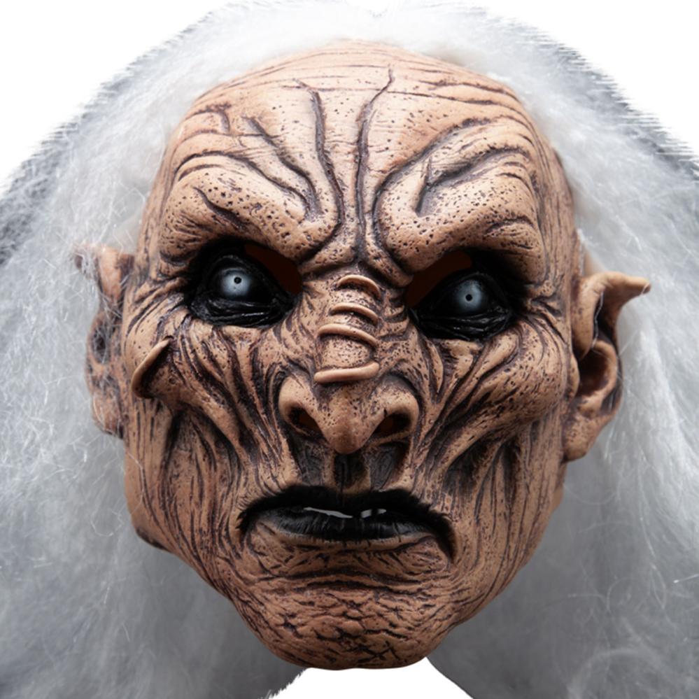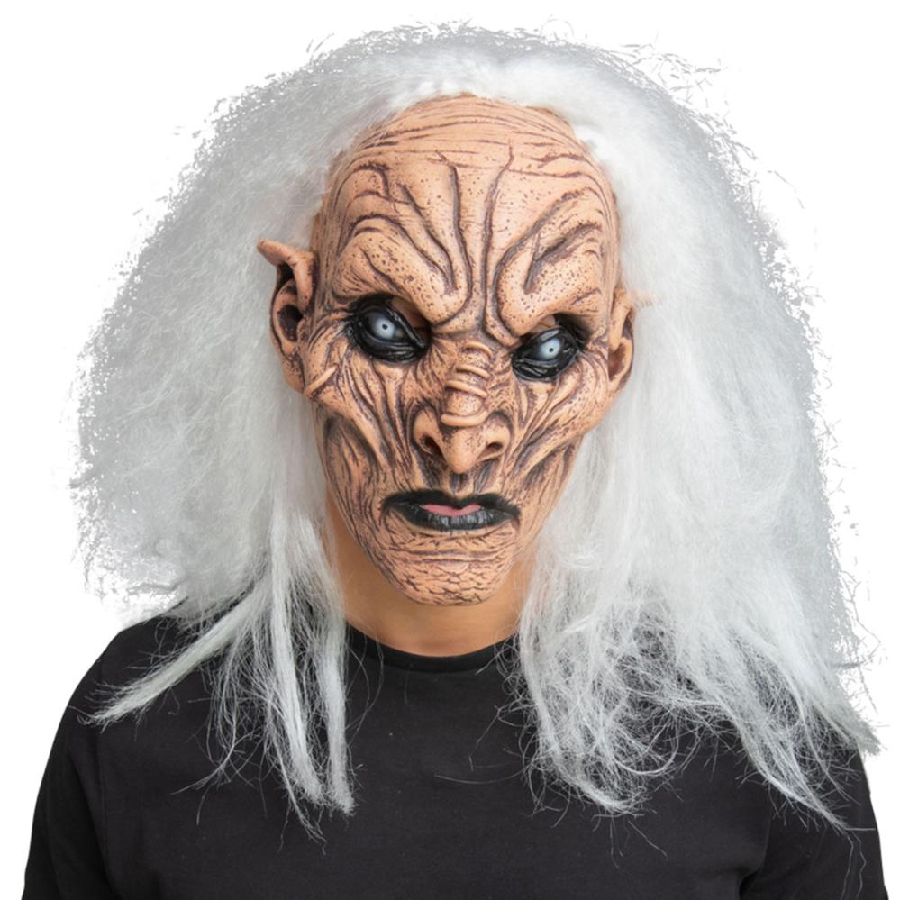 Latexmask med Hår Demon omfattar en beige latexmask med demonmotiv som har svarta detaljer och vitt hår och hålls på plats med ett svart elastiskt band.