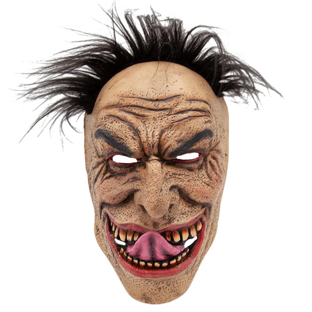 Latexmask med Hår & Läskigt Leende omfattar en läskig latexmask med svart hår, svarta ögonbryn, ett brett leende med gula tänder och en utstickande tunga. Masken hålls på plats med ett svart elastiskt band.
