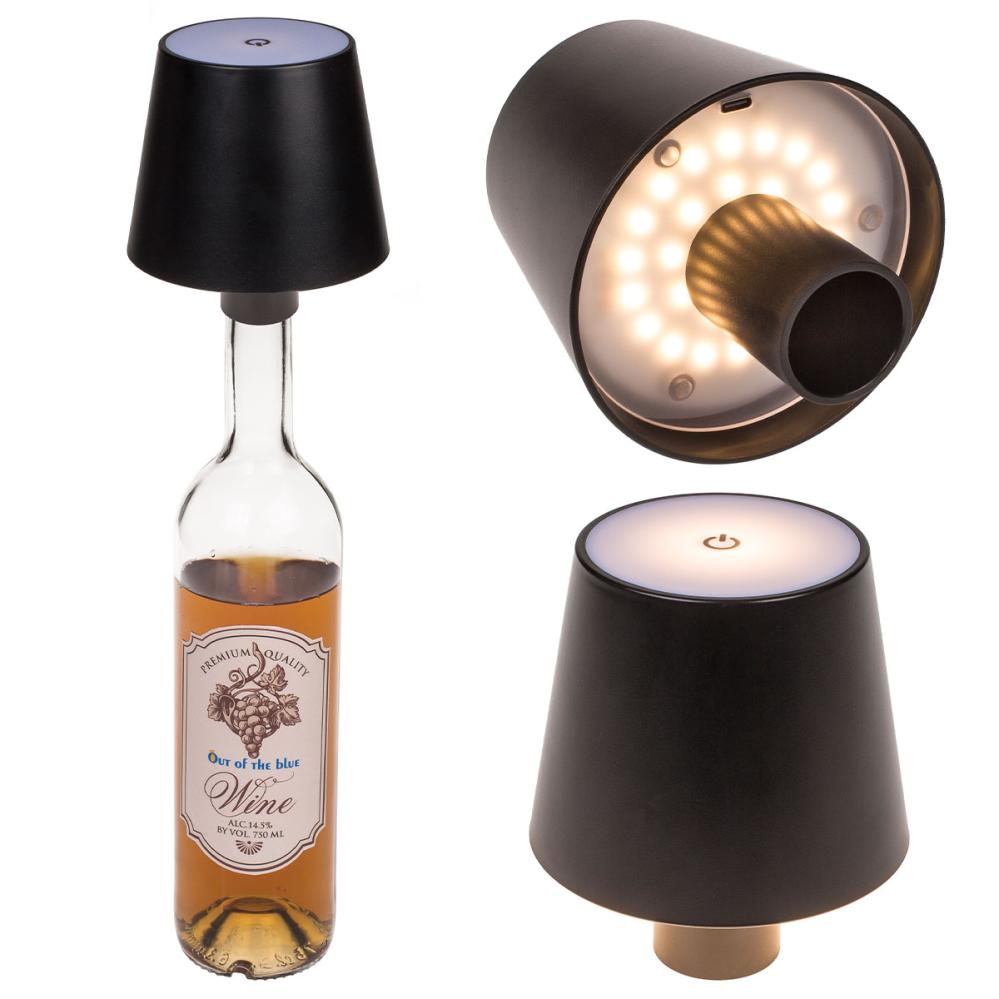 LED-Flasklampa Svart 10,5 x 12 cm omfattar en LED-lampa som placeras direkt på flaskhalsen och passar de flesta flaskstorlekar. Lampan har tre olika ljuslägen som enkelt växlas genom ett tryck på toppen. Den laddas med den medföljande USB-laddaren och ger cirka 4 timmars belysning efter ungefär 3 timmars laddning.