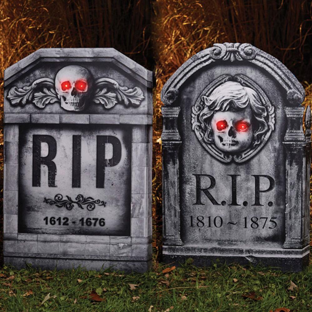 LED Gravsten Dekoration omfattar en papp dekoration med motiv av att se ut som en gravsten med två stycken LED-lampor som lyser upp ett ansikte på gravstenen. Gravstenen har har kanter med markfästen som ger gravstenen ett 3D utseende. LED-ljuset styrs med en on/off switch på baksidan och drivs med två stycken CR2032 batterier som ingår.