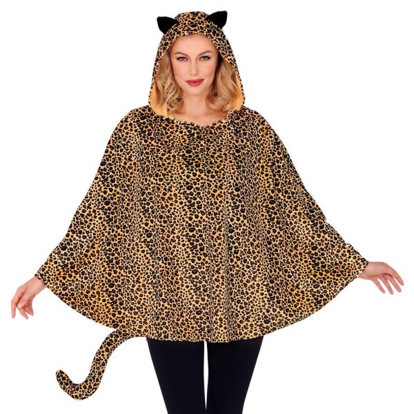 Leopard Poncho omfattar en brun, leopardmönstrad poncho med svans och huva med små öron. Ponchon är tillverkad i polyester, kommer i one size och passar vuxna.