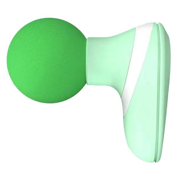 Liten Massagepistol Grön omfattar en grön massagepistol i litet format. Massagepistolen har ett vibrerande runt huvud med sex olika intensitetsslägen som kan användas på olika delar av kroppen. Massagepistolen laddas med USB-sladd och är 9 x 8,5 cm stor. Tillverkad i plast.