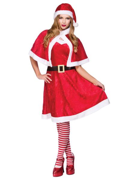 Little Miss Santa Klänning och Cape innehåller en kort sammets-liknande tomteklänning i rött med vita kanter, en matchande cape, en tomteluva samt ett svart bälte med guldspänne.