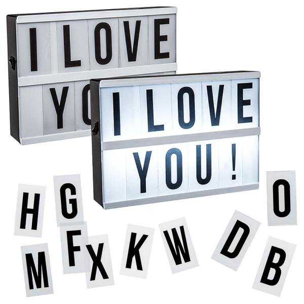 Ljusbox med Bokstäver omfattar en svart och vit ljusbox med LED-belysning. Medföljer 60 stycken svarta bokstäver och symboler att fästa på ljusboxen.