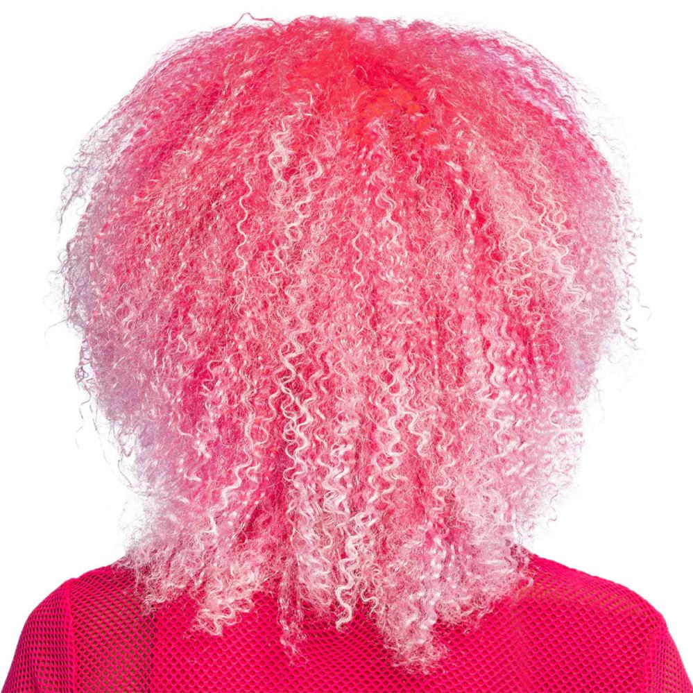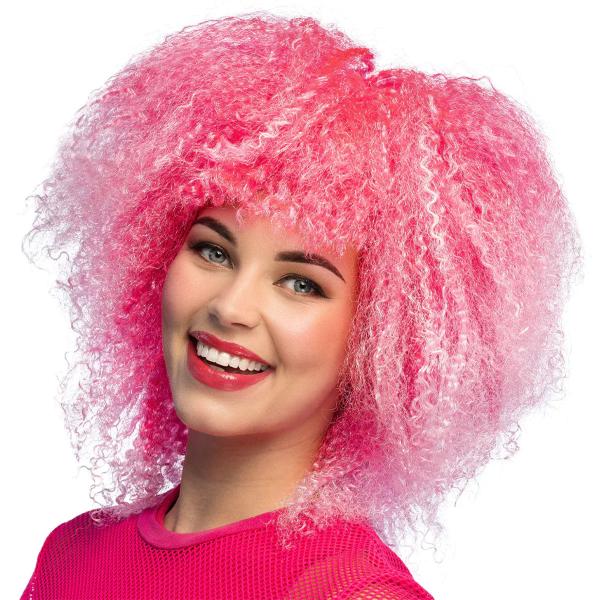 Lockig Peruk Neonrosa omfattar en axellång peruk med fluffigt och lockigt neonrosa hår.