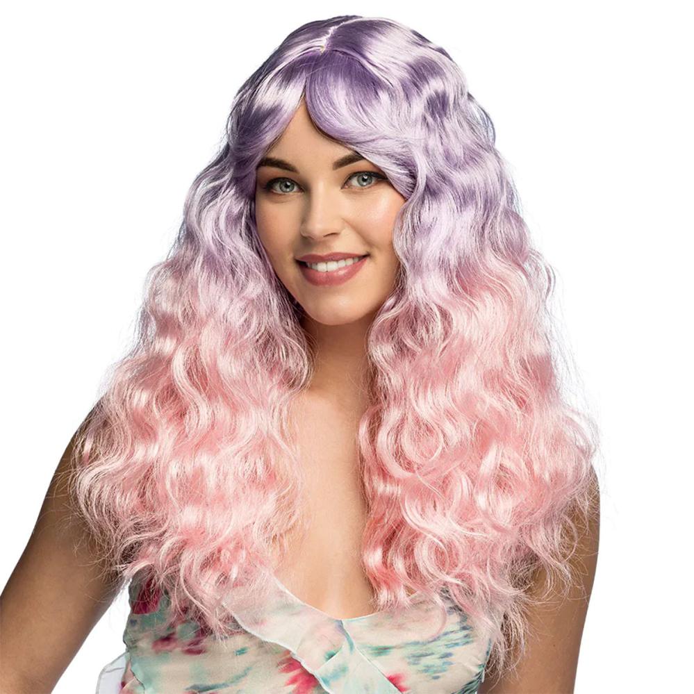 Lockig Peruk Rosa/Lila är en lång peruk med lockigt hår i rosa och lila.
