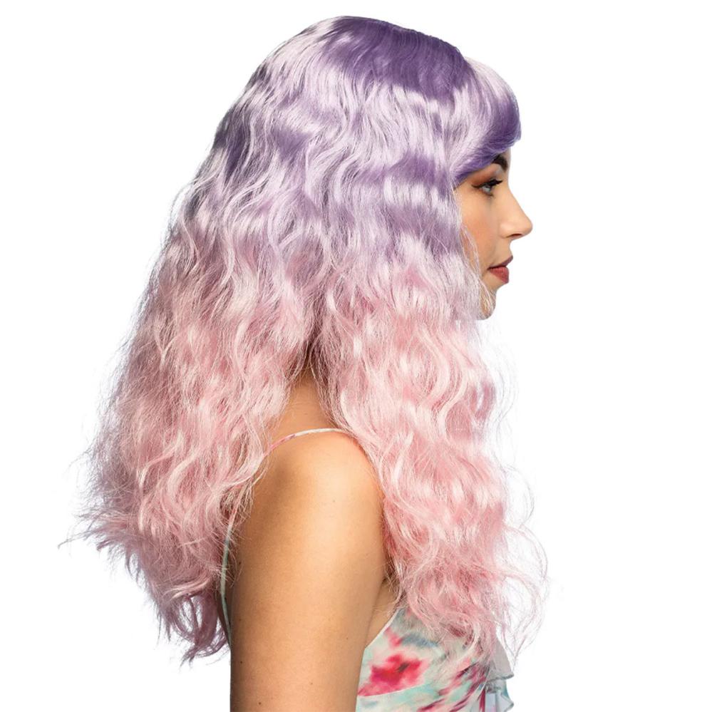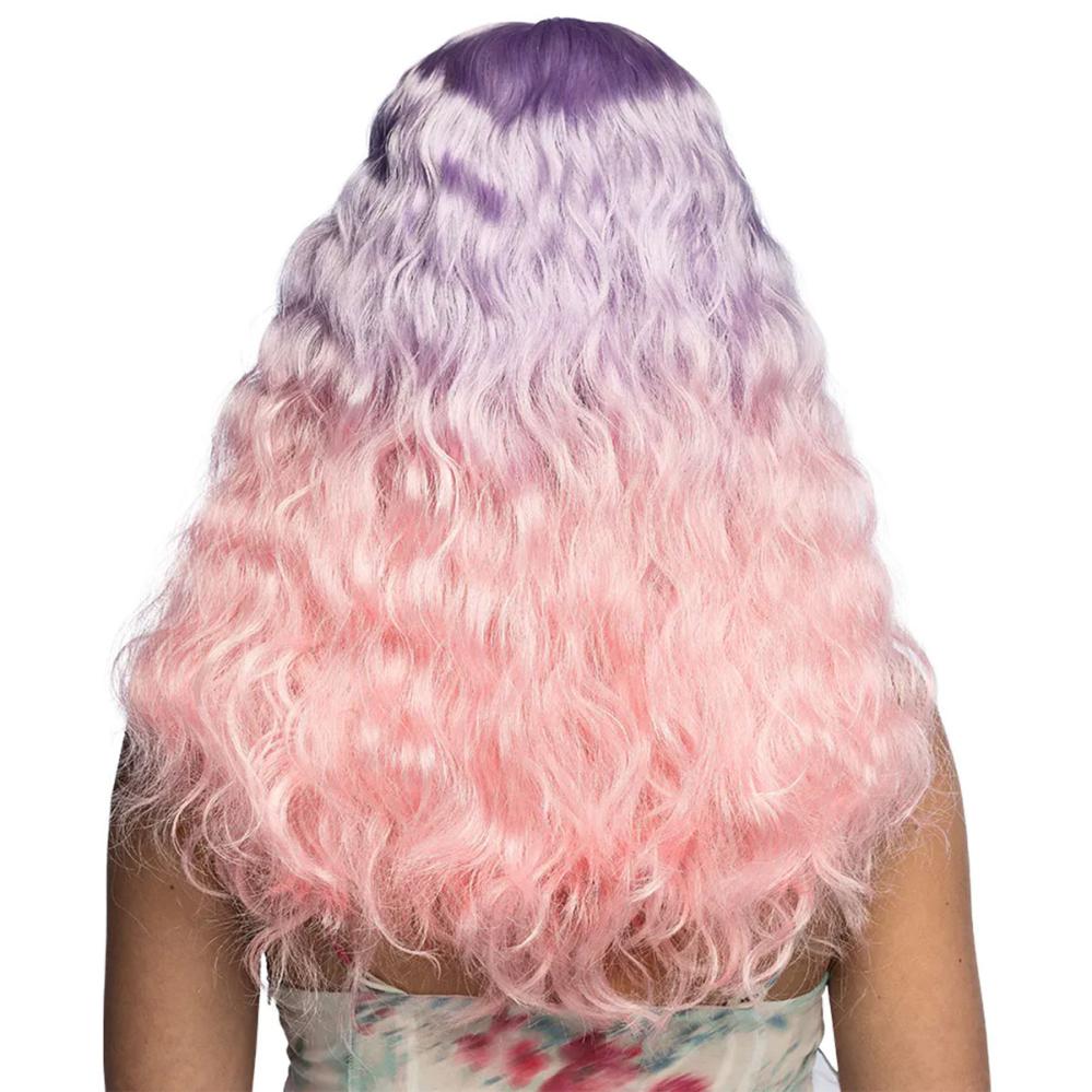 Till en maskerad skapar en peruk ett lekfullt uttryck där rosa samspelar med lila i ett lockigt och glansigt hår, medan modellen upplevs som behagligt lång utan att trassla. Använd ett hårnät för bättre passform och kamma varsamt före kvällen.