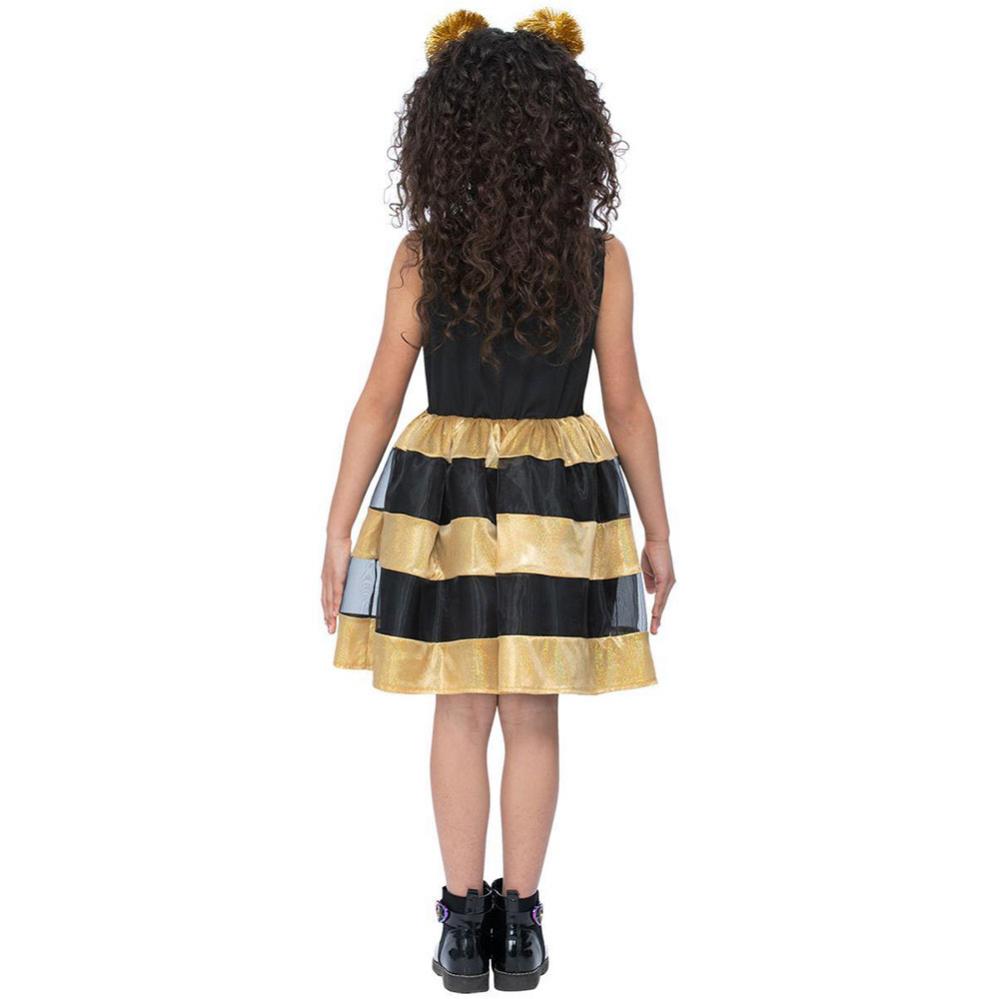 LOL Surprise Queen Bee Maskeraddräkt Barn omfattar en klänning med svarta och guldglittriga ränder med ett L.O.L Surprise! motiv på bröstkorgen samt ett svart diadem med två fluffiga och guldiga bollar.
