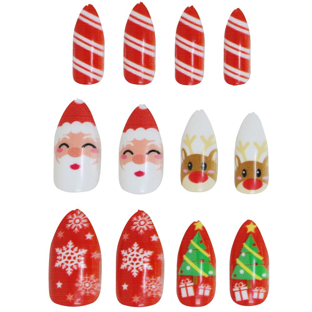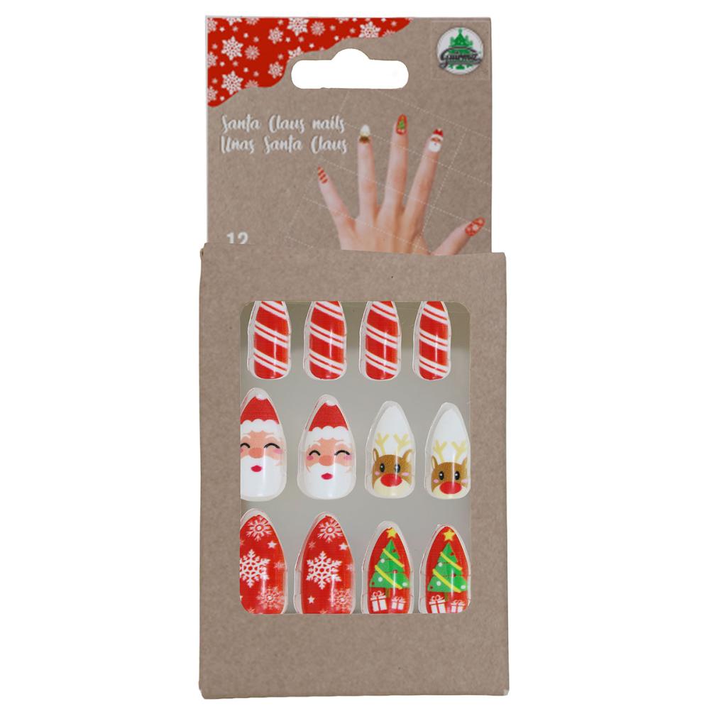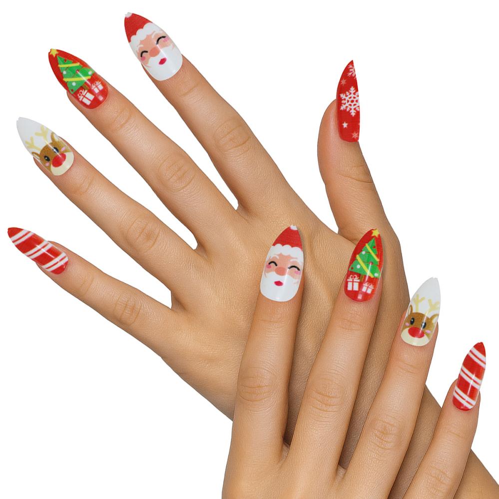 Lösnaglar Jul omfattar ett set med tolv självhäftande lösnaglar dekorerade med fem lekfulla julmotiv: polkaränder, Rudolf, tomten, snöflingor och en julgran med julklappar.