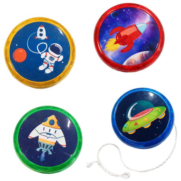 Lysande Jojo Rymden omfattar en jojo med rymdmotiv på båda sidor som lyser rött när den används. Jojon finns i färgerna grön, blå, gul och röd, och varje färg har sitt eget motiv. Säljs osorterad och styckvis så det blir en överraskning vilken färg du får.