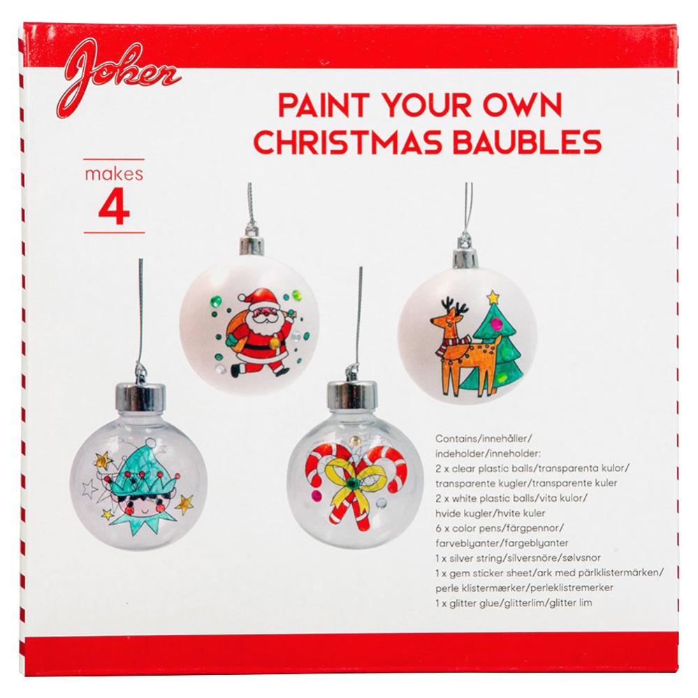 Måla Dina Egna Julkulor Set omfattar ett kit med allt du behöver för att dekorera egna julkulor. Kitet innehåller två genomskinliga och två vita julkulor i plast som du själv får dekorera med medföljande tillbehör i form av färgpennor, klistermärken i form av färgglada diamanter och glitterlim. Julkulorna hängs upp med silversnöre.