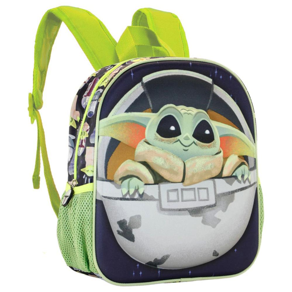 Mandalorian 3D Ryggsäck Tur omfattar en barnryggsäck med Mandalorian 3D motiv. Ryggsäcken har ett grönt bärhandtag, justerbara gröna vadderade axelband, två gröna nätfack på sidorna och ett marinblått fack med grön dragkedja.
