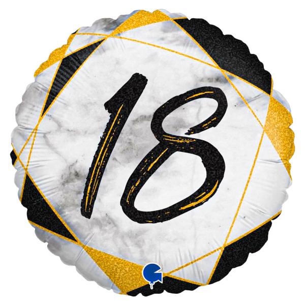Marble 18 Holografisk Ballong Svart omfattar en glitter holografisk rund folieballong med vitt marmormönster och detaljer i guld och svart samt texten "18".