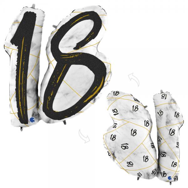 Marble 18 Holografisk Sifferballong Svart innehåller en folieballong i form av siffan 18. Ballongen pryds av vitt marmormönster, "18" texter i svart samt guldiga detaljer.