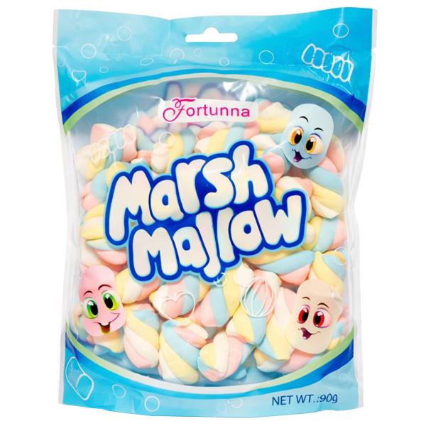 Marshmallows Twist 90g är en påse med 90 gram marshmallows i vitt, gult, blått och rosa.