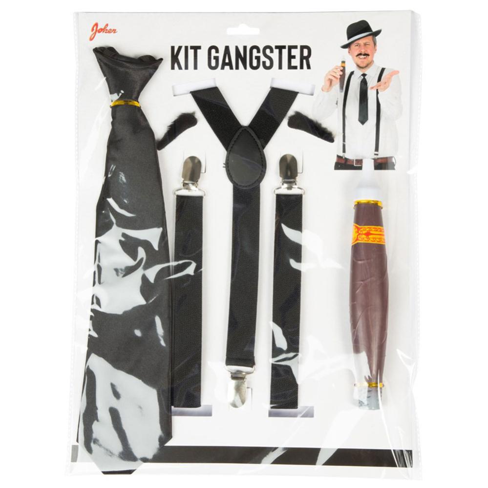 Maskeradtillbehör Gangster är ett kit som inkluderar svarta och justerbara hängslen, en låtsas cigarr och mustasch samt en svart slips som fästs med resårband.
