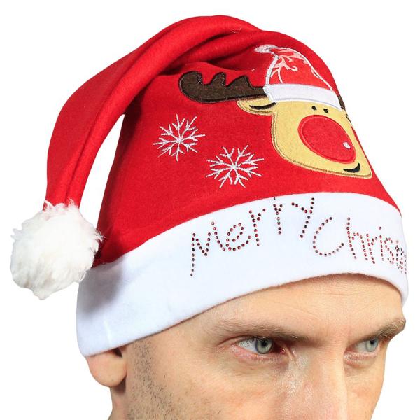 Merry Christmas Tomteluva med Ren omfattar en röd tomteluva som är dekorerad med en ren och vita snöflingor och har en vit pälskant med texten "Merry Christmas" i röda strass.