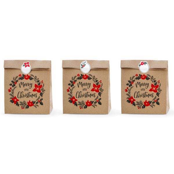 Merry Little Christmas Julklappspåsar består av 3 stycken bruna papperspåsar med fint jul tryck och "Merry Little Christmas" texter i grönt och rött. Ingår även 3 stickers att försluta påsarna med. Klistermärkena har även två rader att skriva på. Påsarna är tillverkade i papper.