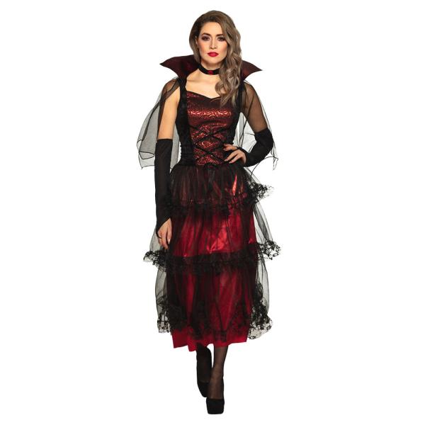 Midnatts Vampyr Dräkt omfattar en röd och svart vampyrklänning med hög krage och dekorativa tylldetaljer. Klänningen är i polyester och kommer i vuxenstorlek.
