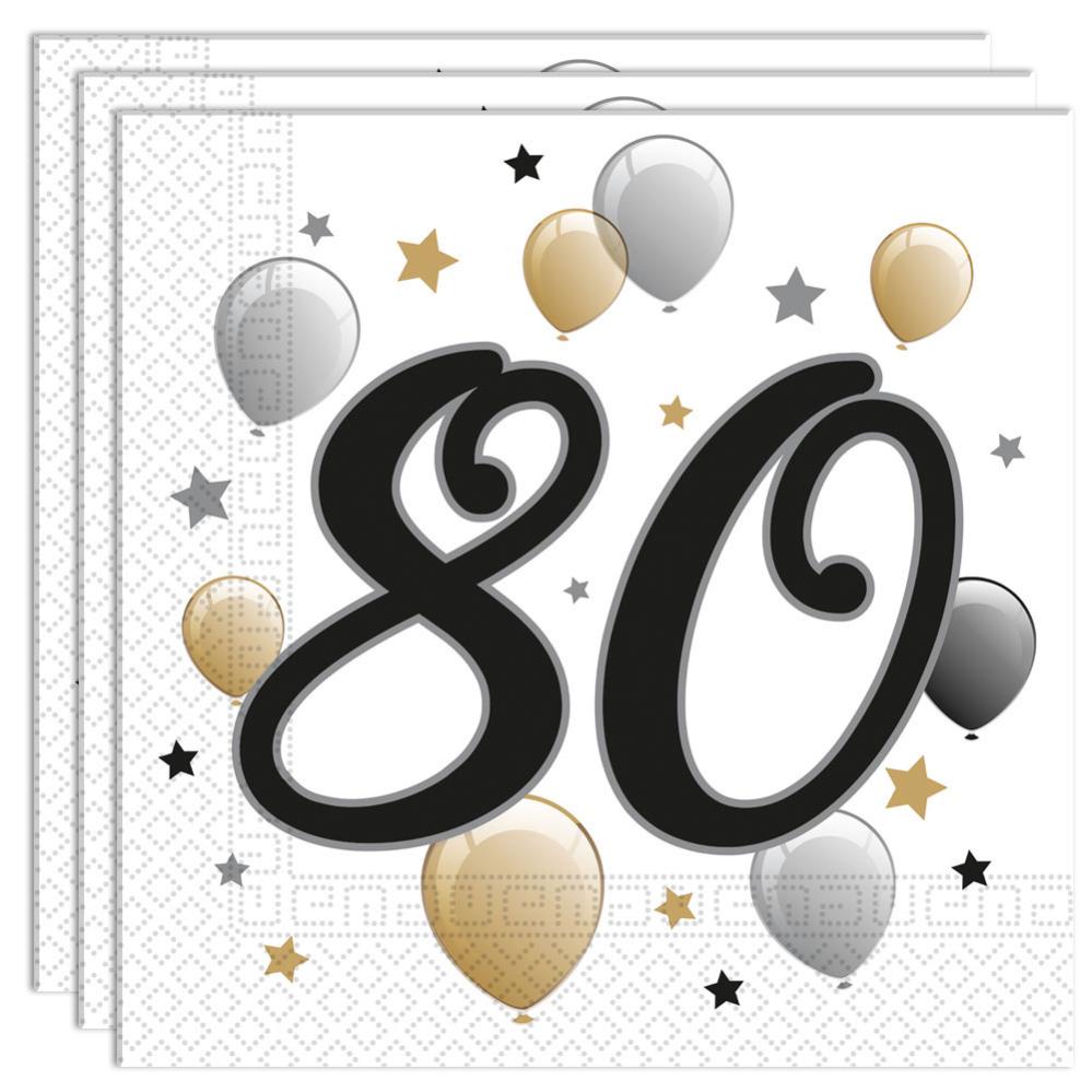 Milestone Happy Birthday 80 Års Servetter omfattar ett 20-pack pappersservetter med två lager och motiv av siffran 80 i svart samt ballonger och stjärnor i svart, silver och guld. Ballongerna är ca 33 x 33 cm stora.
