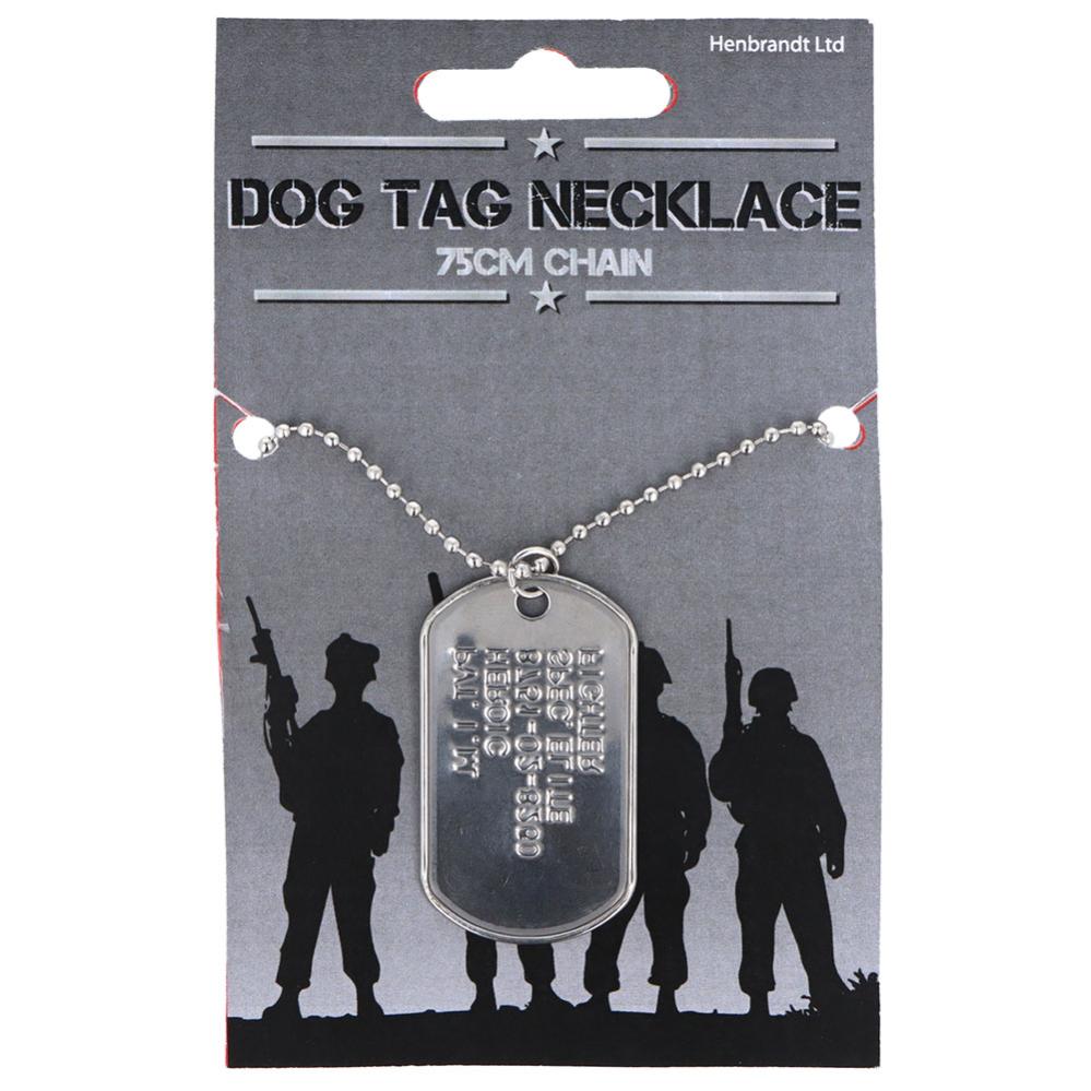 Det här silverfärgade militär halsbandet på 75 centimeter har en kulkedja och en ID-bricka, perfekt för dem som gillar en robust och autentisk look. Detaljer som "HEROIC" och "SPEC. ELITE FIGHTER" gör det extra speciellt.