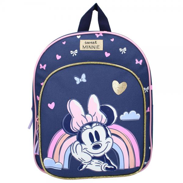 Mimmi Pigg Ryggsäck Barn Sweety omfattar en navyblå barnryggsäck tillverkad av polyester med ett motiv av Mimmi Pigg på framfacket tillsammans med ett hjärta i guldglitter, ett i rosa, ett i ljusblått och två ljusblåa moln, samt en pastellfärgad regnbåge och en kant av guldglitter runt hela facket. Huvudfacket är dekorerat med rosa, orange och vita hjärtan och rosetter, och har en kant i rosa runt hela facket.
