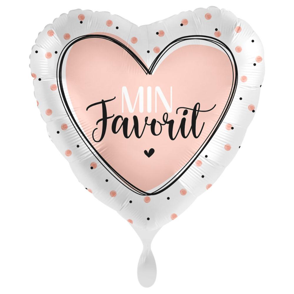 Min Favorit Hjärtballong omfattar en vit, hjärtformade folieballong med svarta och ljusrosa prickar sam texten "Min Favorit" i ett ljusrosa hjärta. Ballongen fylls med luft eller helium och blir ca 43 cm stor.