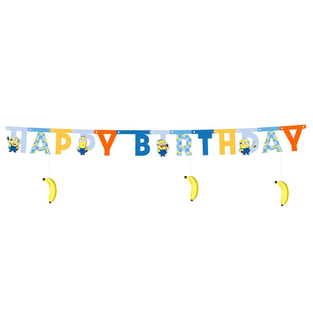 Minions Happy Birthday Girlang 153 x 50 cm omfattar en färgglad girlang som bildar texten "Happy Birthday", där vissa bokstäver har ett blått rutmönster med bananmotiv och andra pryds av olika Minions. Girlangen har även tre hängande dekorationer i form av bananer och levereras med snöre samt vita plastnitar för montering.