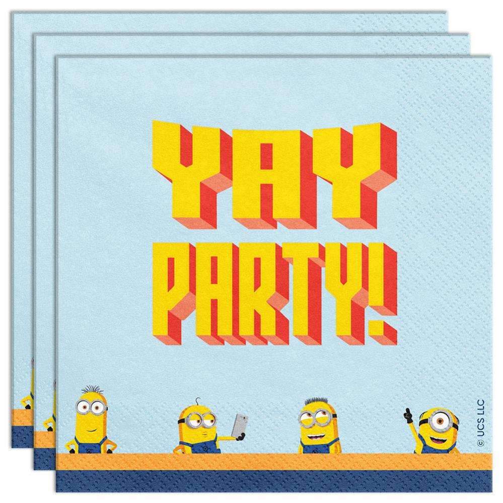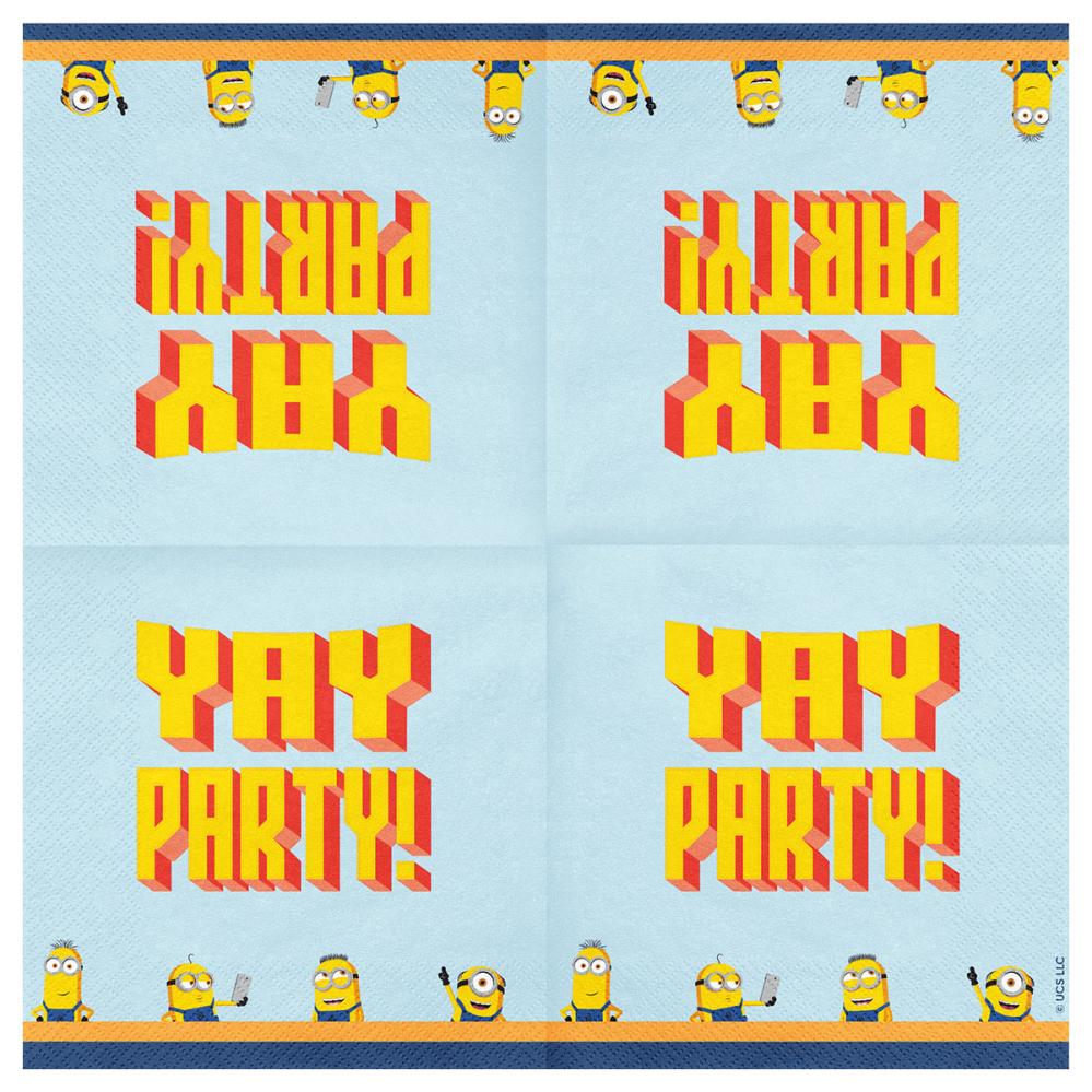 Minions Pappersservetter 20-pack består av tjugo tvålagers pappersservetter i ljusblått, dekorerade med motiv av små Minions-figurer längs den nedre kanten samt texten "YAY PARTY!" i gult och rött.