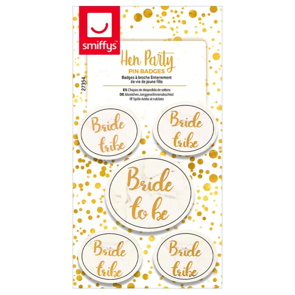 Möhippa Broscher omfattar 5 stycken nålknappar, en stor med text "Bride to be" i guld och fyra mindre med text "Bride tribe".