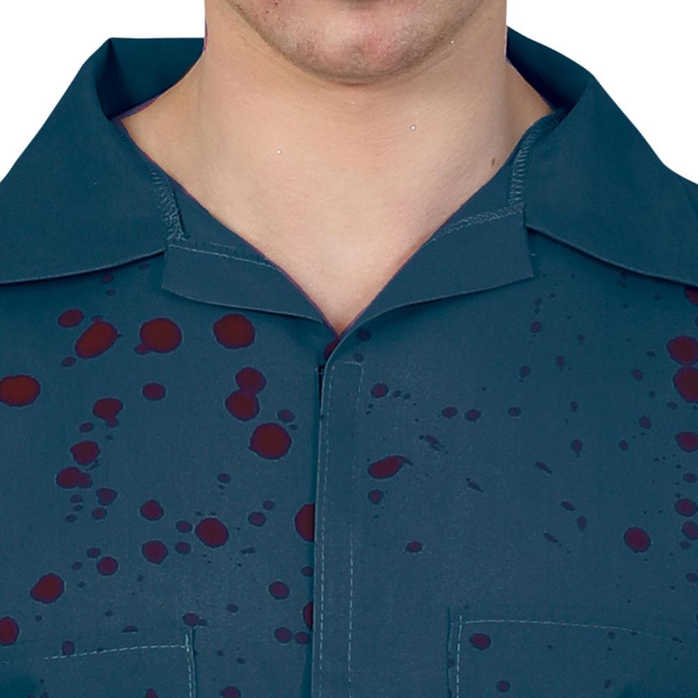 Mördar Jumpsuit omfattar en blå jumpsuit med röda blodstänk.