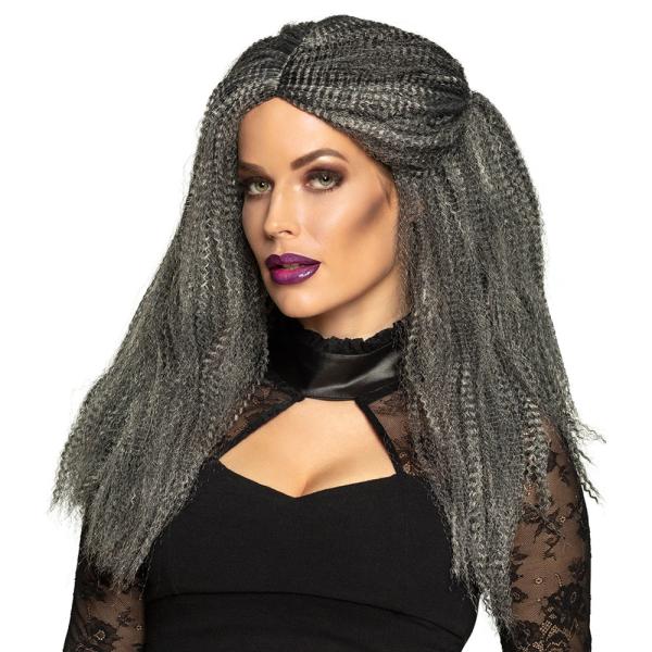 En lång, lockig grå-svart peruk som kan få vilken häxa som helst att känna avund. Med denna häxperuk kan du enkelt trolla fram den ultimata frisyren till din häx maskerad utklädnad.